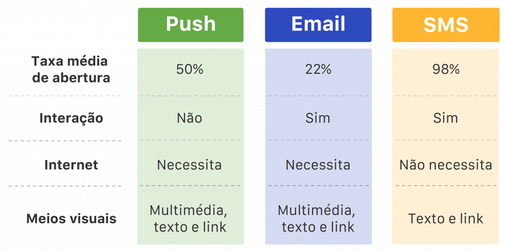 Três dos canais profissionais de comunicação — notificações push, e-mail e SMS — e componentes essenciais para o marketing digital, são excelentes, cada um com o seu propósito. O segredo está em criar uma estratégia integrativa entre os vários canais.